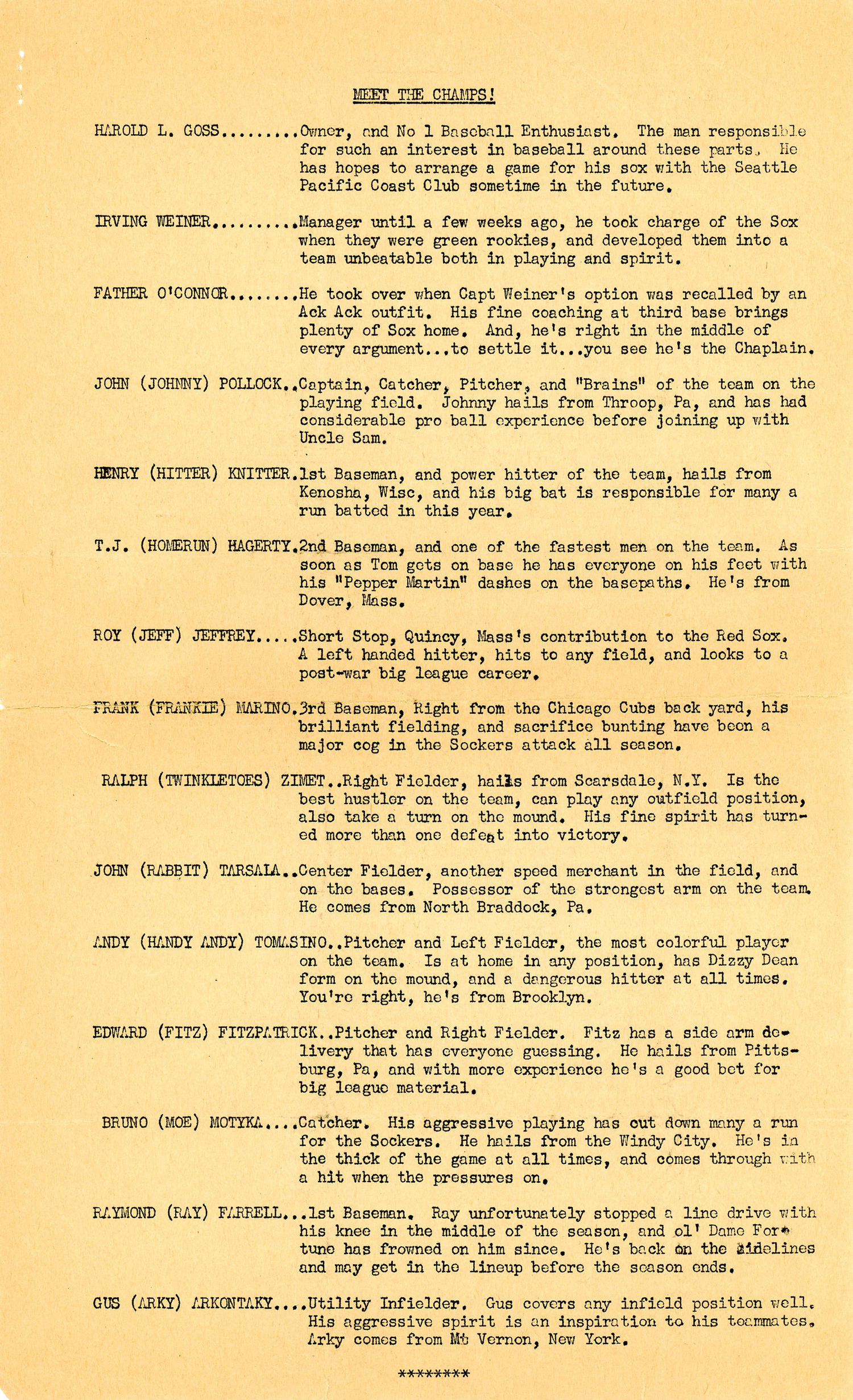 A roster of the 32nd Station Hospital’s players that a relative of Dr. Irving Weiner sent me after this article was first published revealed that the catcher in question was Johnny Pollock, who was also listed as team captain. According to an article on the website Baseball’s Greatest Sacrifice, after being wounded while serving in the 36th Infantry Divison, Pollock “spent eight months at the 32nd Station Hospital, near Naples, and was named athletic director at [the] hospital during that time.”
