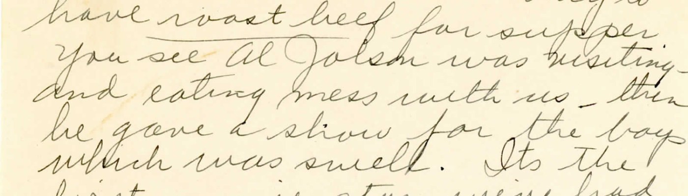 This letter is presented in its entirety. Although it was dated only “Thursday”, Captain Lowell Vinsant‘s journal recorded that Al Jolson’s visit to the 32nd Station Hospital occurred on August 25, 1943. The powder for coloring lemonade was requested in a May 29, 1943 letter.