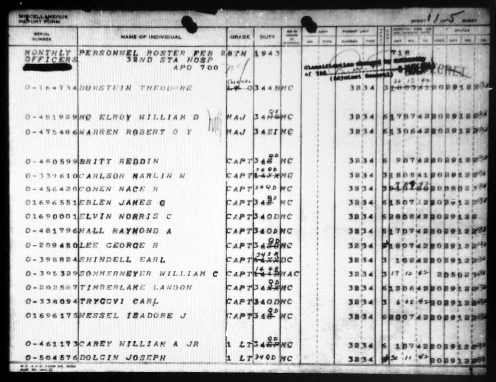 32nd Station Hospital officers’ roster from February 28, 1943, right after the unit began operating in Tlemcen, Algeria. The physical therapists and dietician aren’t listed because they were considered civilians at the time. (National Personnel Records Center)